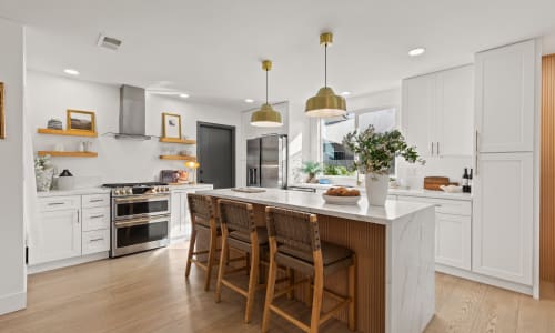 The kitchen? A standout. GE Café appliances, an XL quartz waterfall island, and clean designer finishes create a space built for hosting, casual dinners, and everything in between.